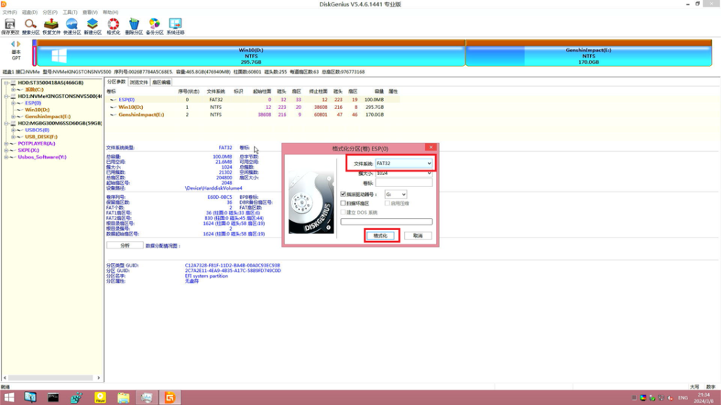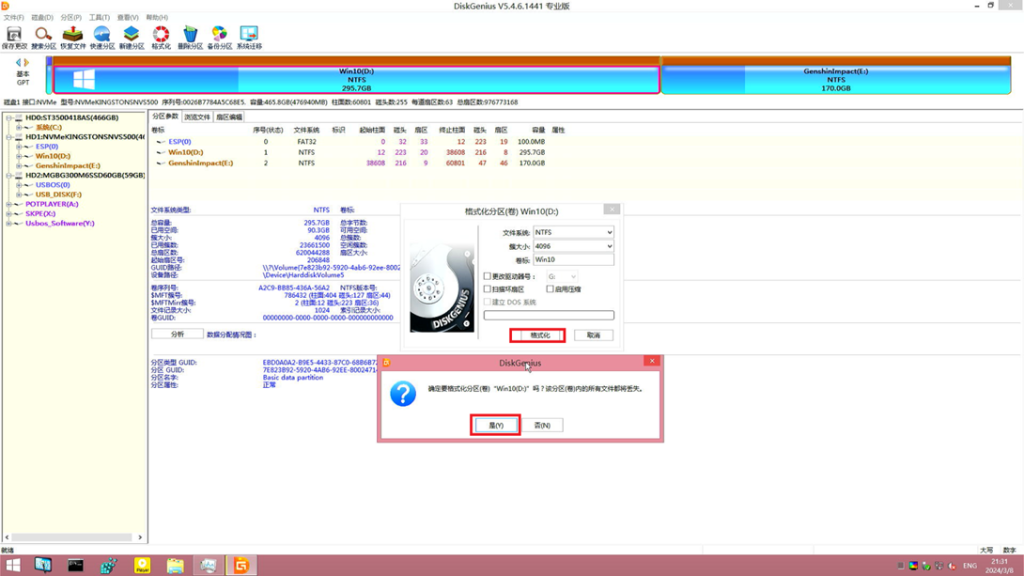 确保系统分区内数据已经备份好后 点击格式化 配置一般不用改 并在弹出的确认窗口中点 是