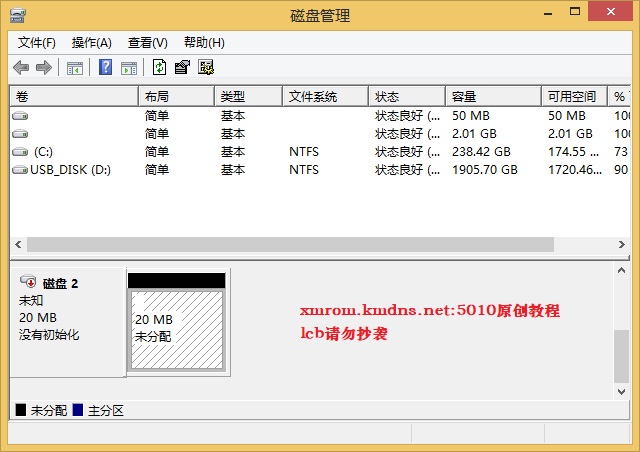 打开电脑的磁盘管理 可以看到这里出现了一个20MB的磁盘 说明短接好了