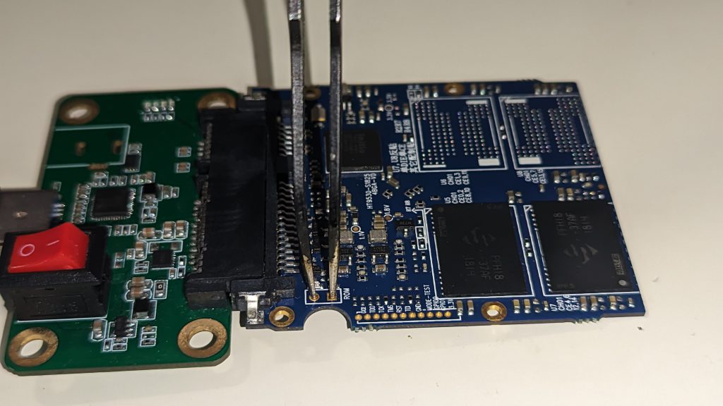 找到短接点后 用镊子 铜线之类一切能导电的东西都行 把这俩孔短接上