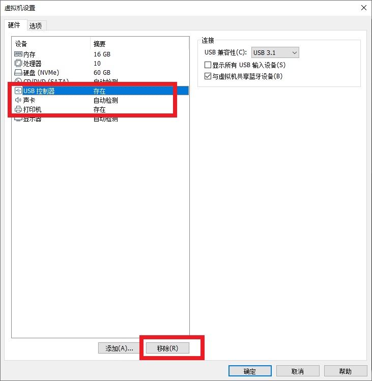 这里把 USB 声卡 打印机 都移除掉 依次操作