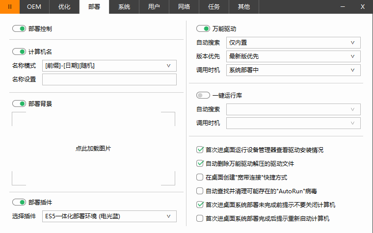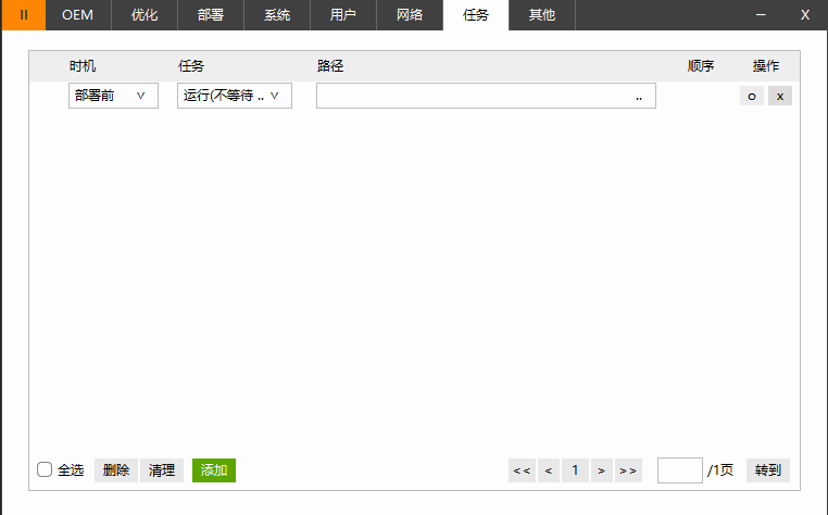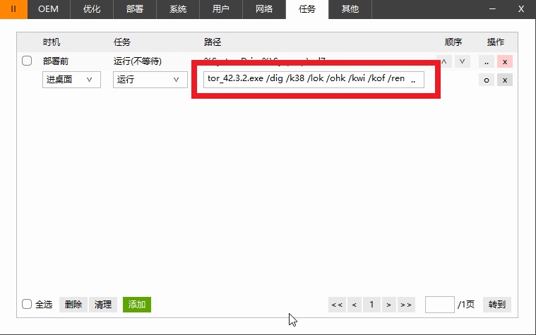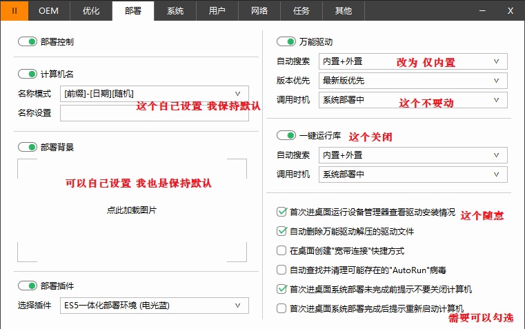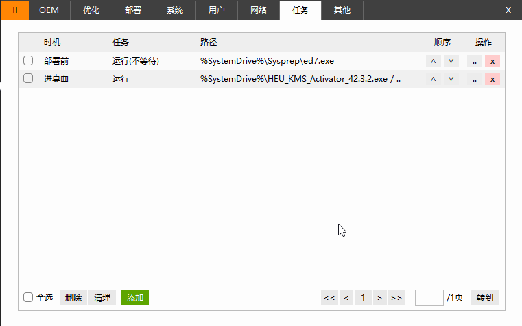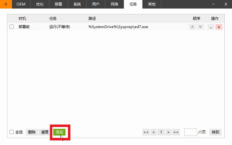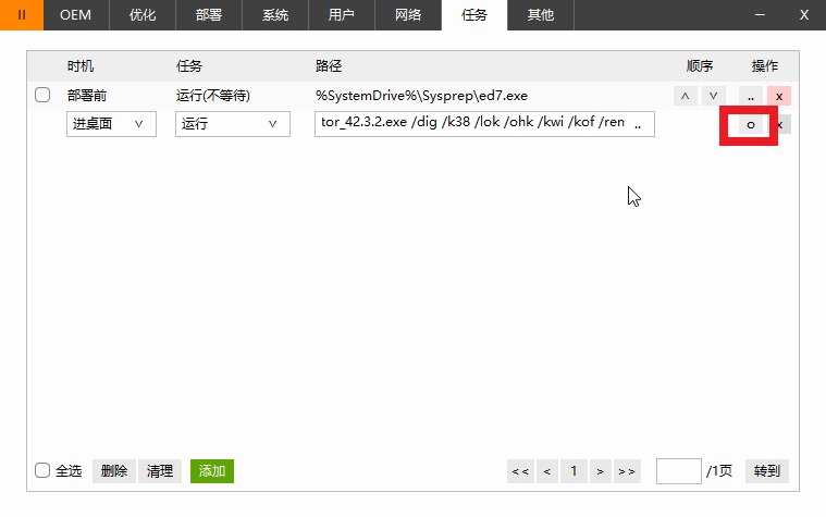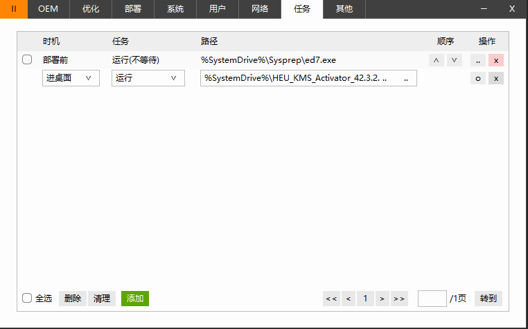 第一个 时机设置部署前 任务设置运行不等待 路径 选择系统盘 Sysprep目录下的ed7.exe 跳过更新提示的那个